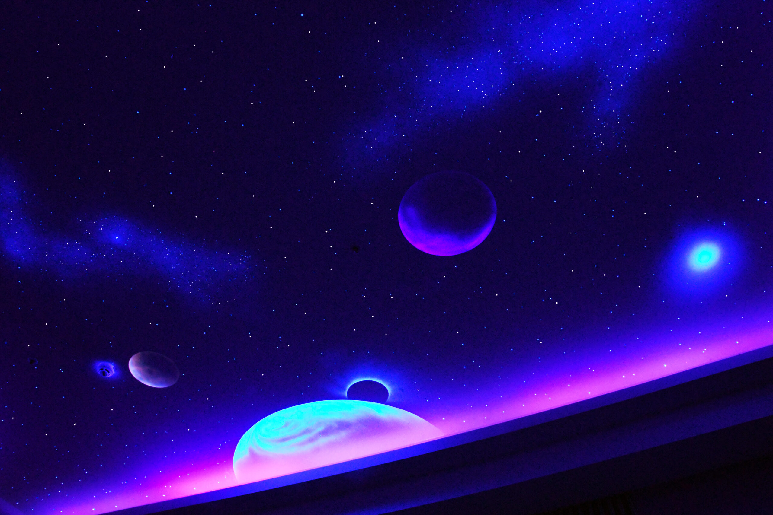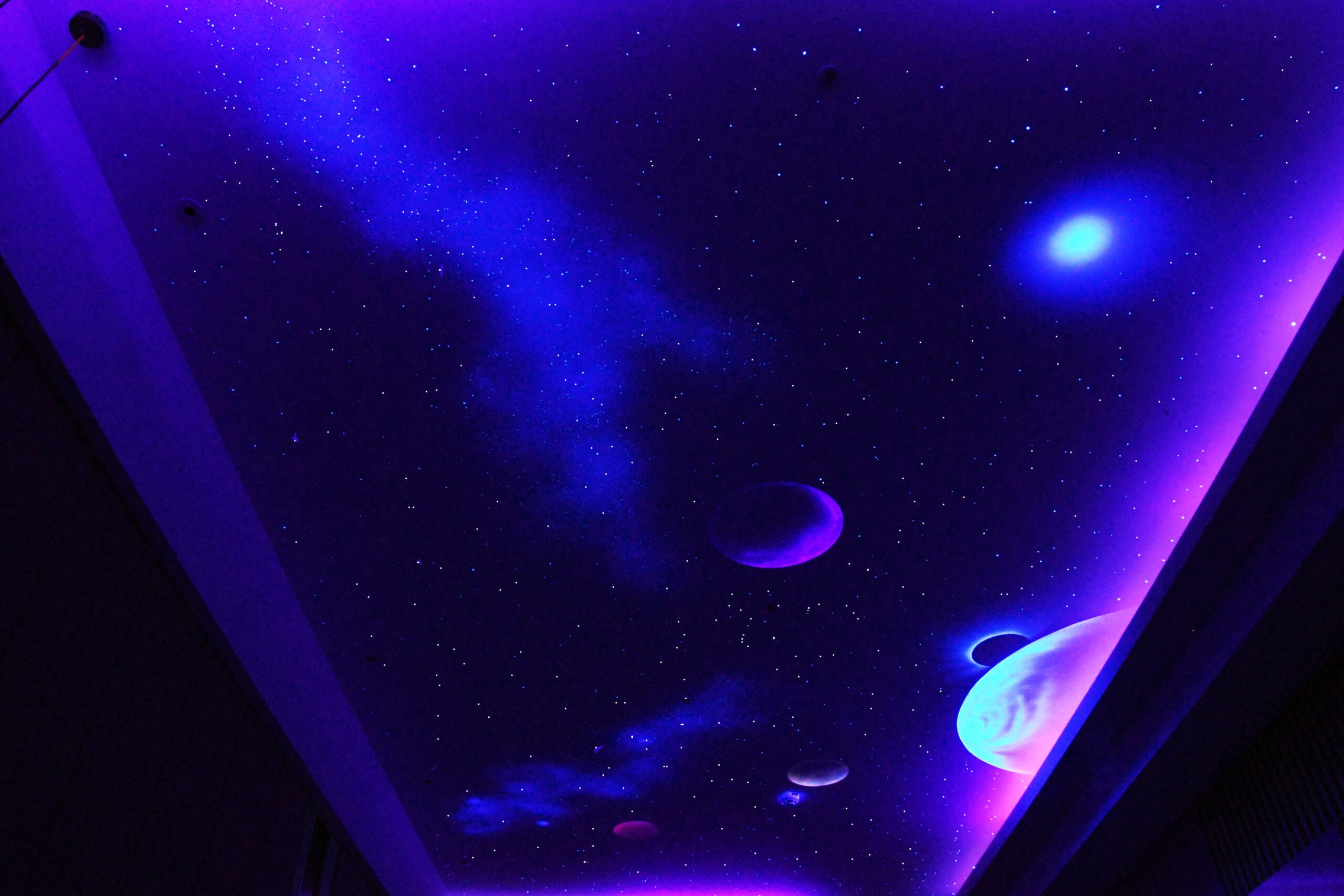 來到了太空,看著地球,看著即將躲在月亮後的太陽,地球慢慢入夜了,觀看宇宙中的其他星球與銀河星雲,這樣的宇宙美景盡入眼簾,彷彿一場宇宙探險即將開始。