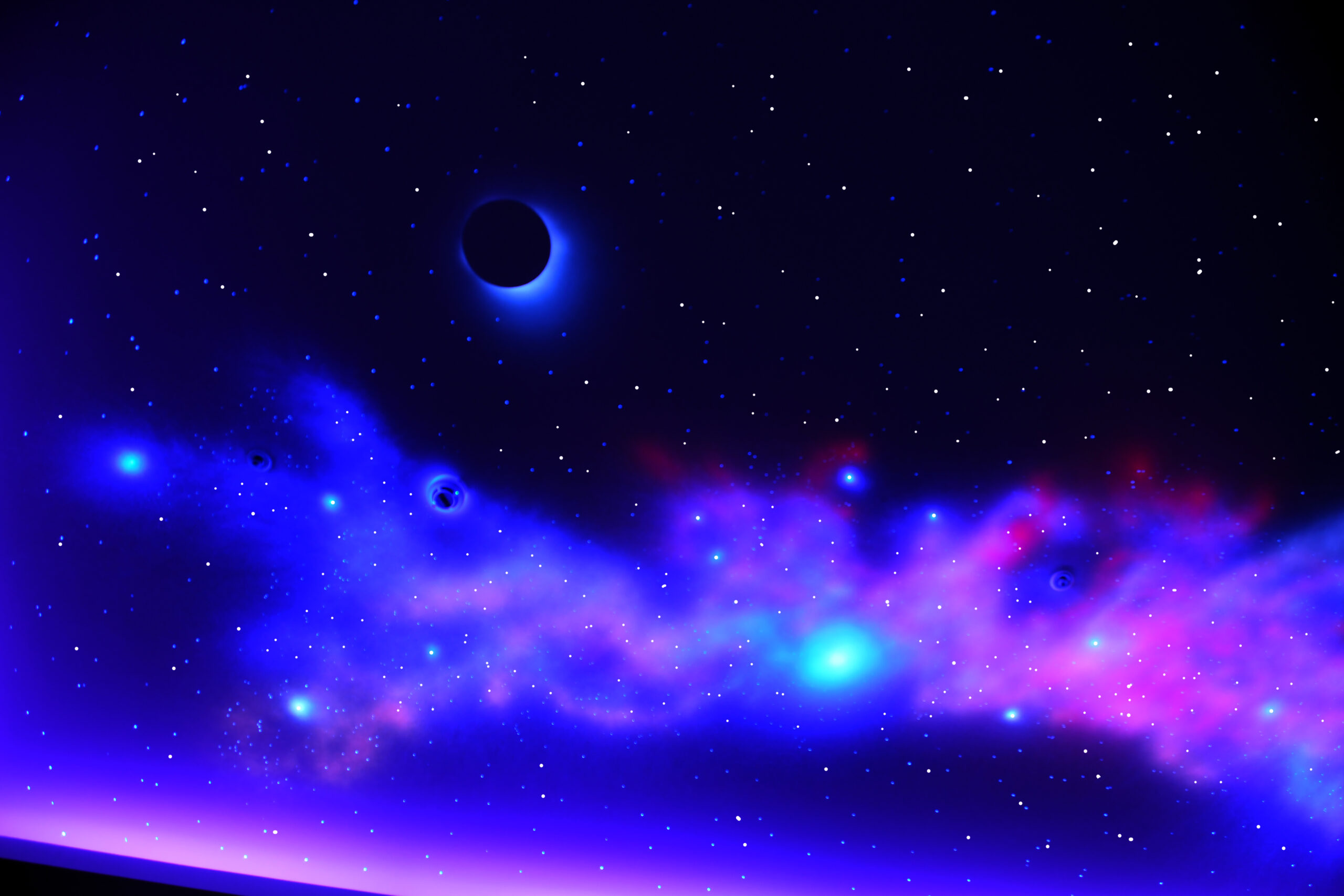 在猶如鳳凰拖著長長尾巴的星雲中,一顆明亮碩大的超新星即將爆炸,也代表著即將有著新的宇宙星系,又或新的星球與生命即將誕生。在一方的星球遮住了太陽的光形成了日蝕的景觀,漸露出的光像在窺探著這美麗的時刻。