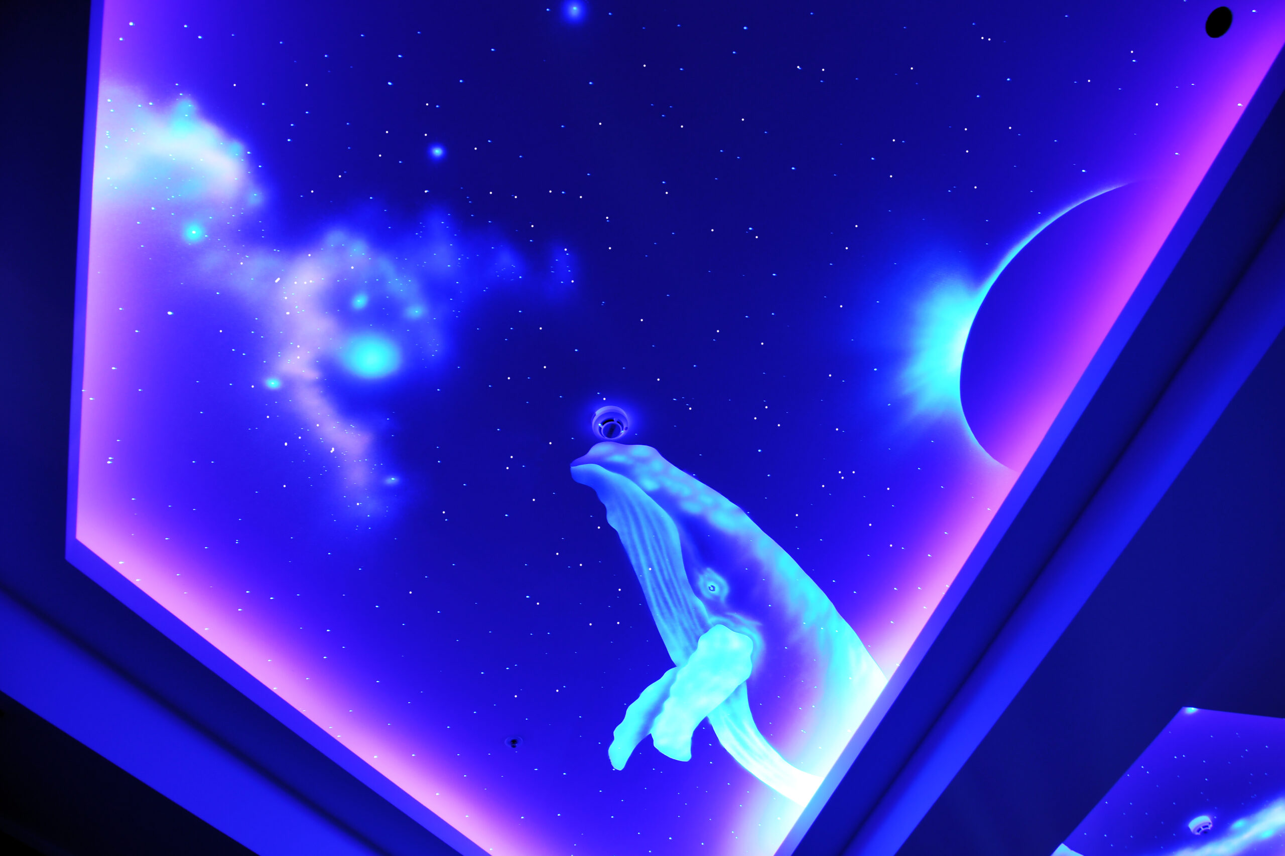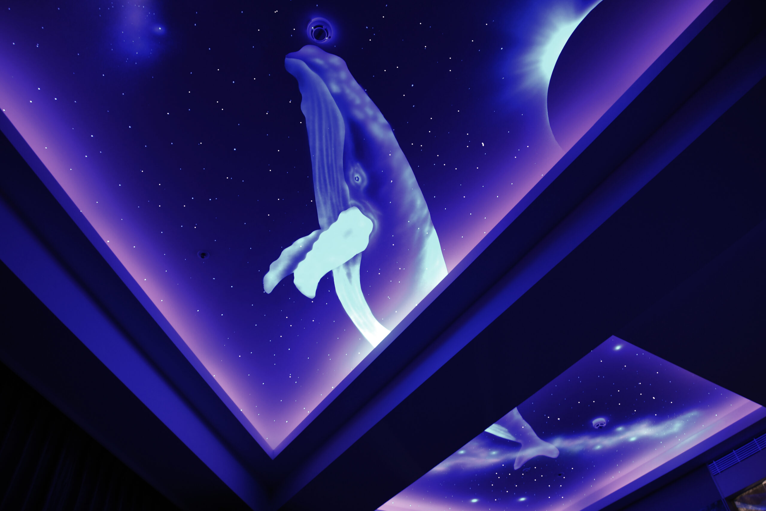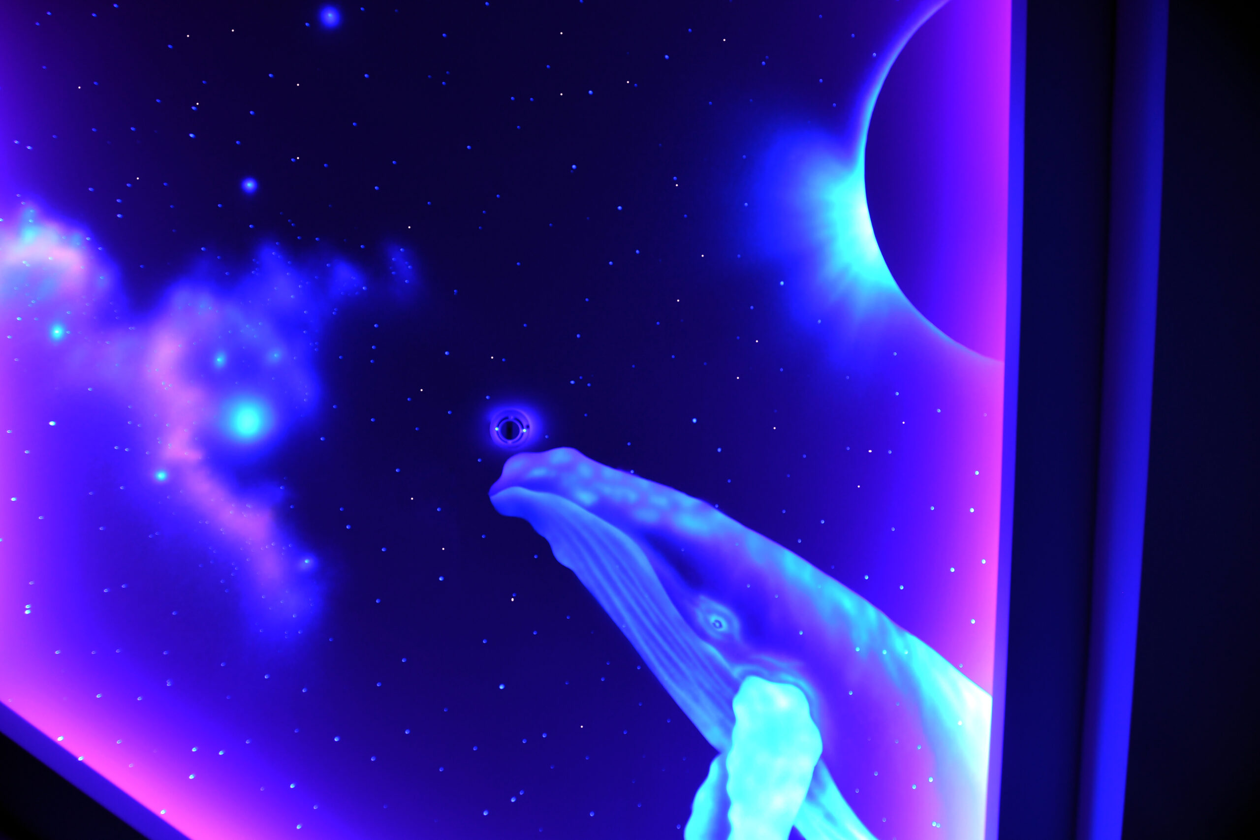 .房間:宇宙的壯闊、銀河的深遠,猶如深海與鯨魚般,想像鯨魚像銀河般出現在廣大的星空宇宙裡,雖然巨大,但在宇宙中又顯得渺小。