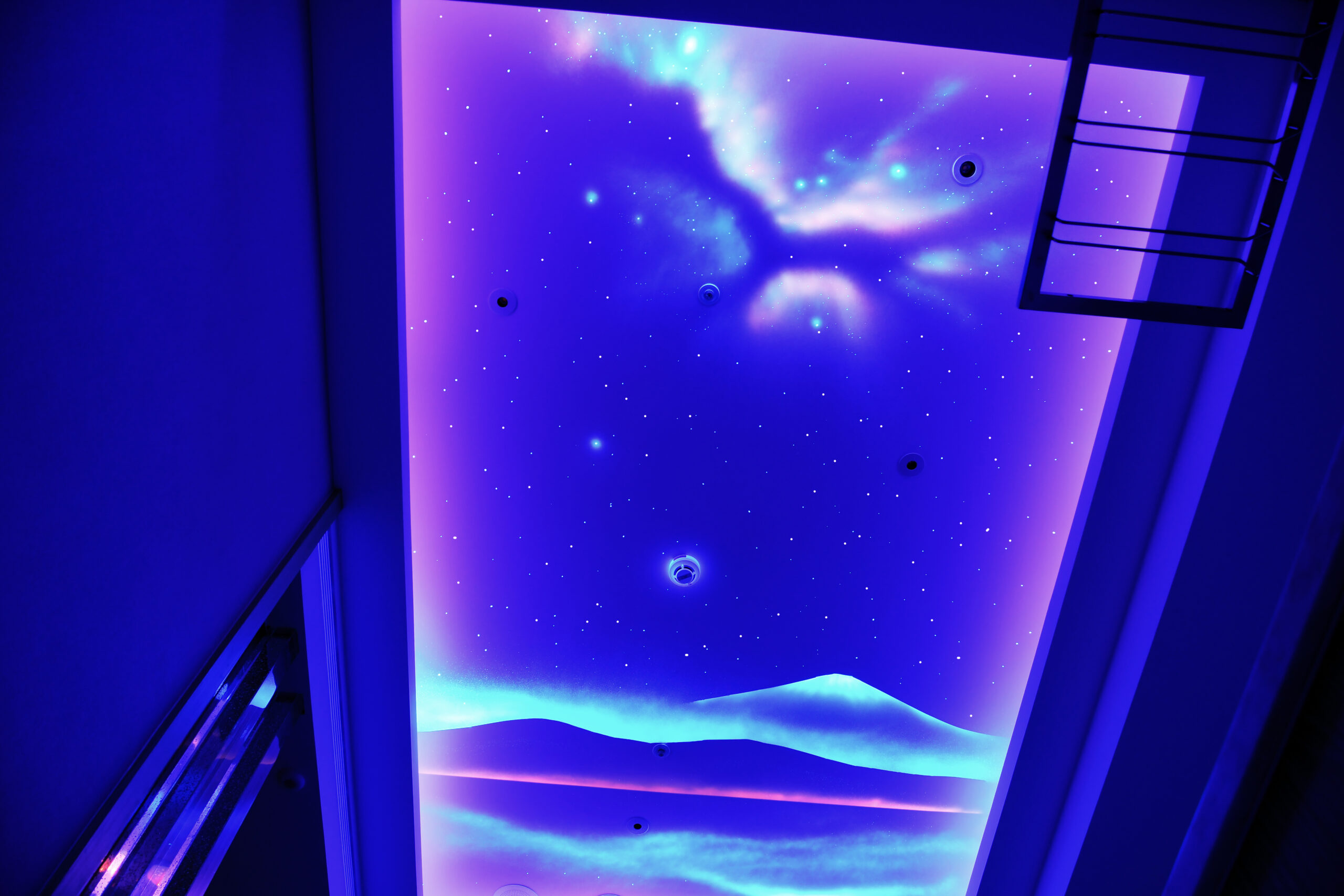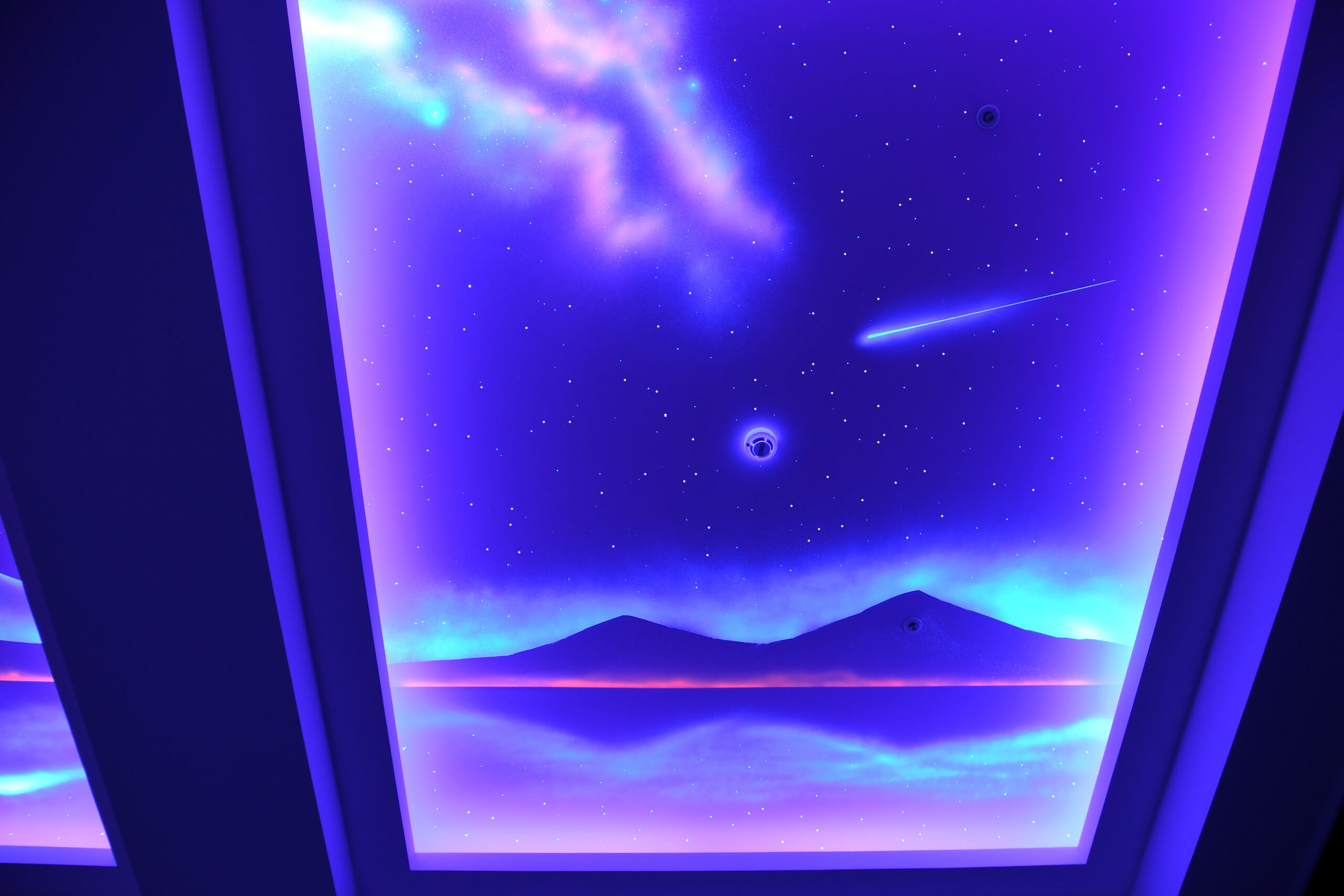.客廳:寧靜的夜空繁星高掛,天際的銀河星雲妝點著夜空。平靜的河口湖面映照著富士山景,寧靜而優雅。